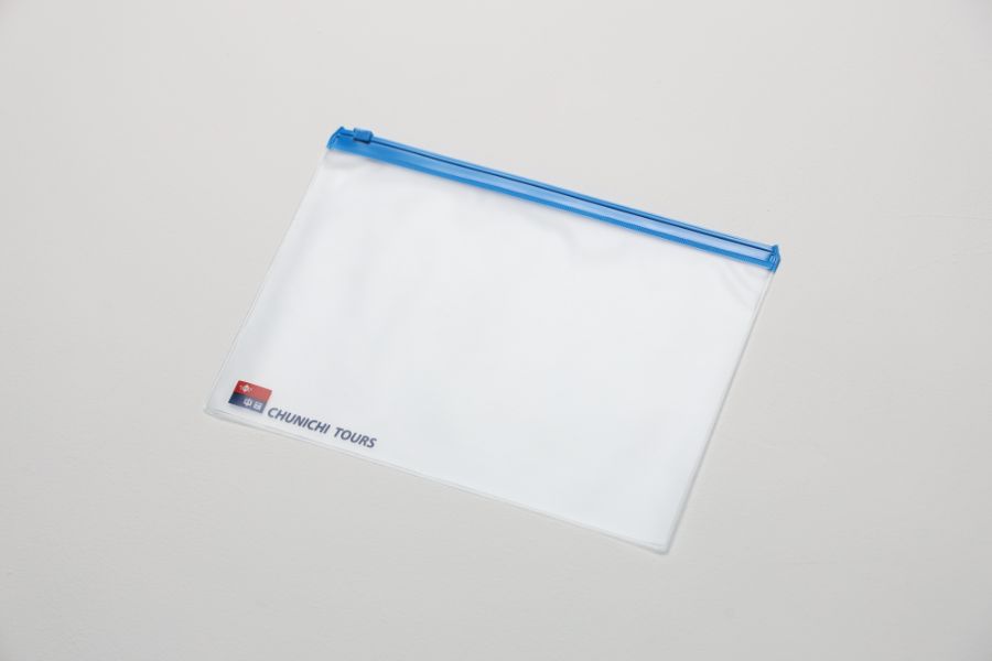 中身が見やすい透明PVC素材を使用した、白色スライダー式ファスナー付き袋